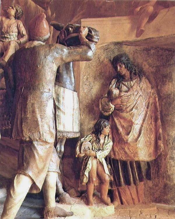 There is some historical information on the arrival of Gypsies in Italy. There is a document from a Venitian court ordering to a group of people to leave the city (1283). It could be the first evidence of Gypsies in Italy, but we cannot be sure about that. It seems a bit early for Gypsies in Europe. It is not impossible, however, we know there were Gypsies in the Byzantine Empire and they could have come to Italy by sea. Another source affirms the presence of Gypsies in Abruzzo (1390). We have substantiated evidence of a group of Gypsies who came from Germany (1423). They arrived in Bolonia and Rome. [Italian Encyclopedy Treccani]. We have a representation of Gypsies (1660). It is in a santuary near Varese (the Sacro Monte - Holy Mountain) where there is a great depiction with statues of the crucifixion (figure 1). In the scene there is also a group of Gypsies. That is due to a popular legend. According this legend the Romans wanted crucify Jesus with four nails, but a Gypsy stole one of them. So Jesus was crucified with three nails. The statues are by Dionigi Bussola (1615–87). We are not sure why so few Gypsies settled in Italy until recent years. We suspect it had something to do with the Papacy which in the medival era and until Italian unification (1860s) controlled Rome and much of central Italy. There were persecution of Gypsies in Italy for centuries.