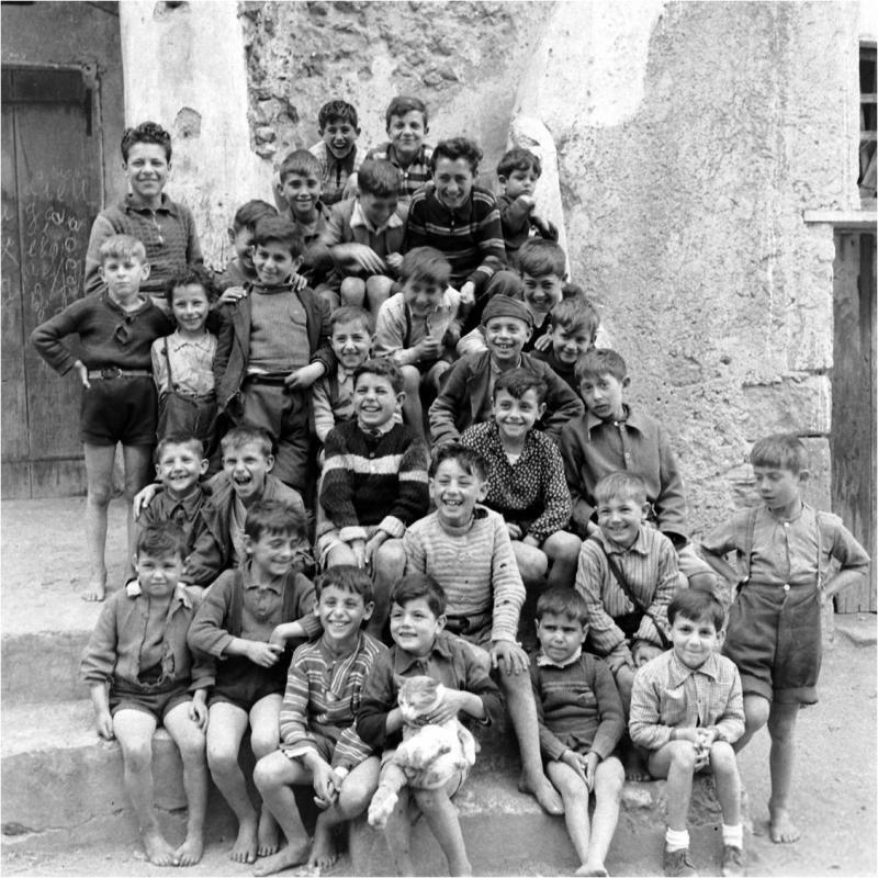 sustenance by agriculture or as sharecroppers or as daily farmhands, or as fields owners. It was this that generated massive emigration to the United States, Argentina, Brazil, and other countries beginning in the late-19th centuy. People emigrated from all over Italy, but especially from the south where economic conditions were especilly depressed. Another element worth noteing is that the poor agricultural families are very large. On the previuous page we see a good example. That is influenced by several elements. The Catholic tradition sees the children as a blessing. Sometime there was also a certain 'machismo' of the men that so showed their stamina. During the Fascist time the regime actively promoted large families as a component of national power. Mussolini constantly bragged about his '8 million bayonets'. On the other hand in the traditional organization of the agicultural work with few or no machines the children was work force since early age, while the expenses were limited: the same poor meal of the family, old clothing that wore the older brothers, no shoes. The photograph here shows a group of boys in an unidentfied southern Italian village just after World War II (figure 1).