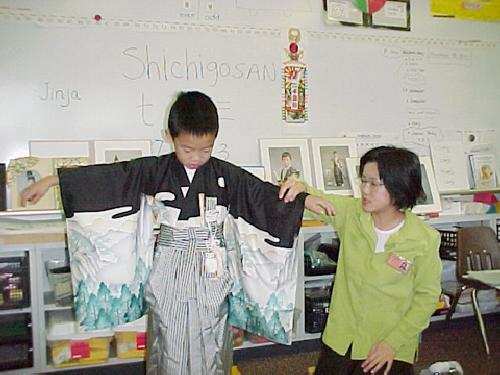 Children dress up in traditional costumes on some holidays. This is especially common for Kodomo no hi--Children's Day. The holiday is celebrated May 5. It is also common for Shichigosan. This is the celevration when children turn celebrates the 7-5-3 (sichi-go-san) festival for children who have just or will soon turn 3, 5 and 7 years old. The official day for the festival is November 15. We also believe that children may dress up in traditional outfits on other holidays as well. Some families may all dress up in their traditional garments for a New Year's portrait.