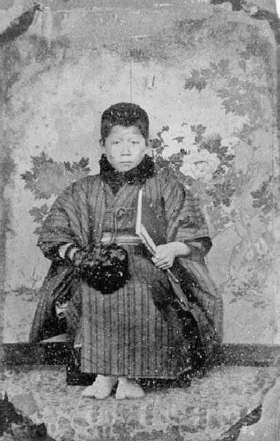 We note a wonderful Anbrotype portrait of Matsuda Komataro who looks ready to sett of for school in 1885. This Japanese Ambrotype portrait is of Matsuda Komataro. Japanese cased portraits were commonly done in wood without guttaperca or leather covers and plush interiors. As a result of the wood, inscriptions are more common than in Western cased photographic portraits. The case herev is inscribed " Taken by WATANABE Tomio living in Kotohira Village ( Ehime Prefecture, Shikoku Island ) on March 7, Meiji 18 (1885) ". The portrait was 5cm x 8.2cm. The boy looks to be about 10 years old. We would guess that the outfit he is wearing is what he wore to school. Note the school book and ruler. In addition to the traditiibnal outfit, note the separated toe socks. I'm not sure what he has on his right hand--perhaps mittens. Maybey it was winter. He does seem to be wearing a wool scarf.