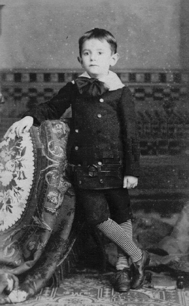 Boys commonly wore suits in the 19th century. We have not informtion on the early-19th century. We suspect thst boys wore skeleton suits, the populsr style in Europe. Boys in the second half of the 19th century wore the msny suit styles popular in Europe. Younger boys once breeched wore cut-away jacket suits with knee pants and bloomer knickers. The unidentified Montivedeo boy on the previous page in the 1870s is a good example. He wears a cut-away jacket and vest. Notice the fancy embroidery work. We also note other suit styles like collar buttoning jackets and lapel jackets. The boy here wears a collar buttoning jacket with a bow (figure 1). We believe it was taken in 1877.
