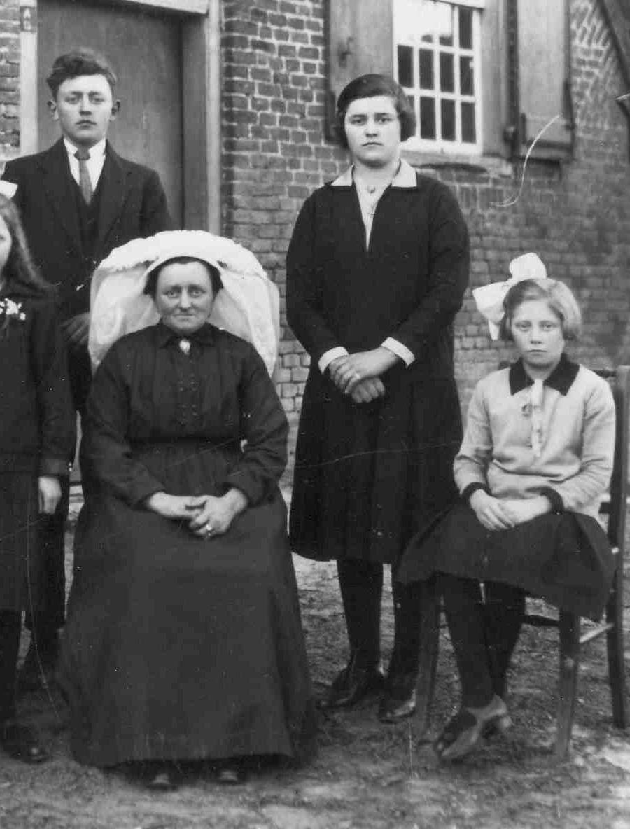 This is the rural Doorn-Broeren family (1930). It was obviously a big family, as rural families often were. There were several children, both boys and girls (figure 1). Standing (from left to right) in the back row are Jos, Toon, Jan and Drieka. In the front row sitting (from left to right) are Piet, Sien, Lien (standing), Marie van Doorn-Broeren (the mother and matriarch), and Mien. The picture was taken in front of their farm house. Notice the mother's elaborate traditional Dutch headdress. The children are all very formally dressed. Piet (the 12-year-old in the front row, extreme left) is wearing a dark knee pants suit with white shirt and tie, black long stockings (probably with a garter waist), and black shoes. Jos, standing behind him, seems to be wearing a long trousers suit, although it is a little difficult to tell. The conservative appearance of this family, especially the fact that they are all dressed in black (except for Sien who is wearing a bright plaid dress), suggests to us that they are Roman Catholic--possibly from North Brabant. The girls all wears dresses or skirts along with hair bows. The hair bow seem an vestahe of 1920s styles, we see fewer of them in gthe 1920s. They also wear black stockings. Long stockings were declining in popularity, but still worn in cold weather and in the children of conservative families. Just where the father of the family is we don't know. He may have been the photographer or he might be deceased.