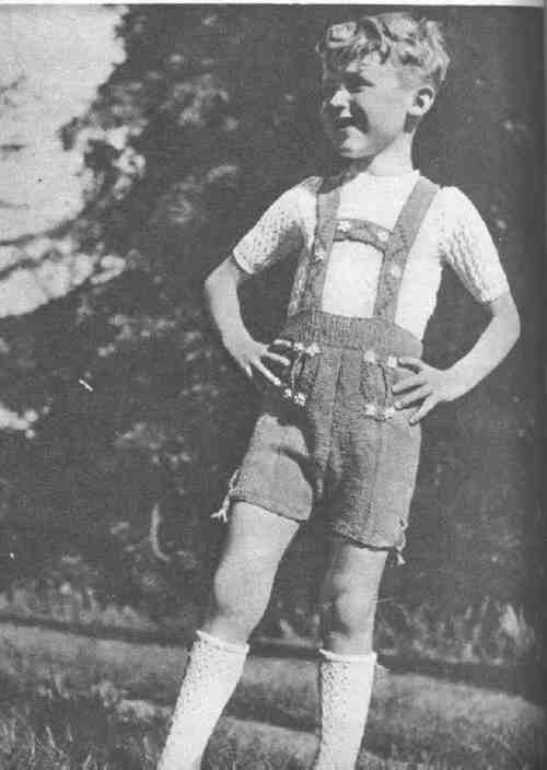 The Trioler style was of some influence and shorts with the Tiroler look were made in other material such as knits, which were very popular in the Netherlands. A Dutch reader tells us, "About lederhosen in the Netherlands, they were not common at all. I mean the real thing made of leather. Little boys very often were dressed in Tyrolean-style