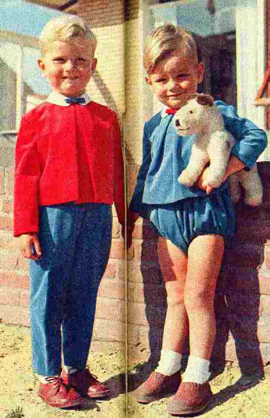 Other romper outfits were a dressy style for a younger child. In some cases a rather plain romper could be turned into a dressy one by adding a formal blouse. Dutch mothers muight dress the boy in a blouse with a Peter Pan collar and puff sleeves for a very dressy look. A bow tie might even be added. Other dressy rompers had tops of various style from jacket-like garments to short smocks. The romper tops were usually quite short so that the romper bottom was not covered. The tops were commpinly worn with white Peter Pan collars. Often the collar was pinned onto the top and not part of a seoparate blouse. The dressy rompers appear to have been worn from about the 1930s through the 1960s. They were generally worn by pre-school boys. Velvet was a popular material for the dressy rompers.
