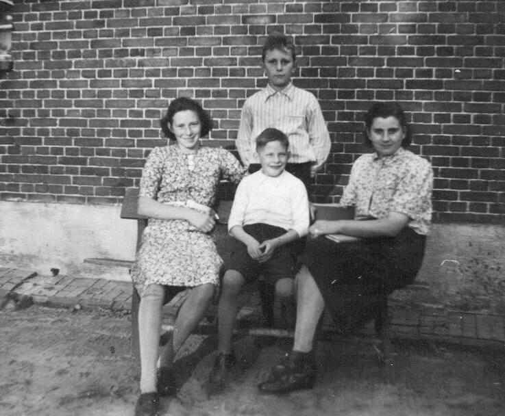 The rural location and Catholic orientation may explain why so many children in the village wore long stockings. During the summer we see the children wearing knee socks, but on cools the children seem to have mostly worn lon stockings. A reader writes, "I agree that these considerations are important. I think Catholic and rural families in the Netherlands insisted on long stockings for their children more often rgan Protestant and urban families. The situation here may have been similar to Quebec, where long stockings were much more common than in Western Canada. In Germany class seems also to have been a factor, but not the only one. The van der Vens, for instance, seem to have been fairly upper class (but also rural and farming families)." Another reader writes, "I believe you are correct about long stockings in Zijtaart being common, not just in formal portraits, but for everyday wear. Notice this photo of the Vervoort family , taken in warm weather during 1943. We see two of the Vervoort children children) with a friend, Bert Kanters and an older married lady. Standing in back is Harrie Vervoort (probably about 11 or 12). Sitting in front (from left to right) is Betje Vervoort, Harrie's older sister (about 17 or 18); Bert Kanters (about 10 years old); and Miet de Valk, who was married to Willem van