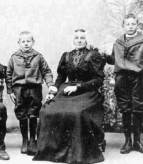 Dutch mothers would in some occassions dress all the boys in the family, or at least the ones of appropriate ages in identical sailor suits. This custom appears to have been most common in the late 19th century when boys of a fairly wide range of ages wore sailor suits. The boys here about 1885 wear virtually identical suits. For some reason the collars are slightly different. The boys appear to be about 10 and 13 years old. The only significant difference is their hair style although both boys sear sdhort hair--the younger boy appears to have an almost shavecd head.