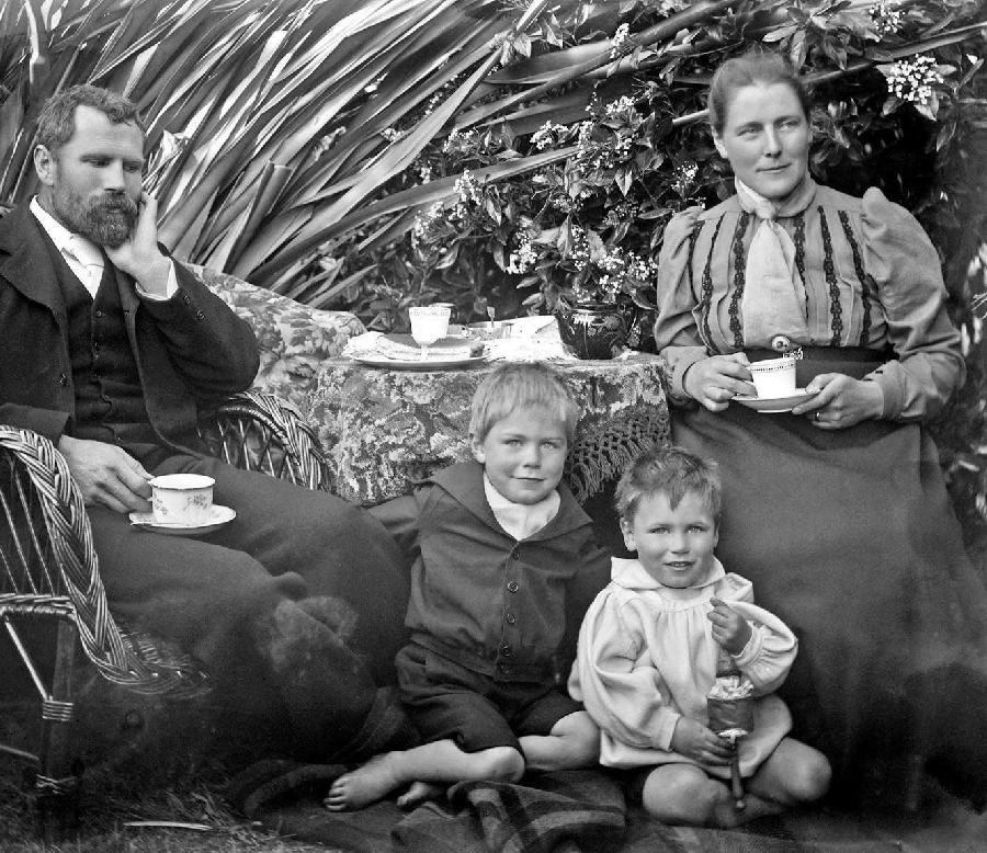 Here we have a family portrait taken in in Christchurch, on the Southern Island of New Zealand. They are clearly a well-to-do enjoying afternoon tea--all very English (figure 1). The portrait is undated, but the mother's blouse clearly dates the scene to the mid-1890s. At the time New Zealand was a British Dominion and the non-Maori population throughly British. A substantial part of the population was either born in Britain or had at least one parent born in Britain. The family is also dressed like the British--except for the children's barefeet. This is most visible differnce. That was already common in New Zealand even fir the well-to-do, but not in Britain--except among the poor. A major factor of course was the climate. The older boy wears a basic sailor suit. We are not sure about the younger boy, but his white outfit may be a tunic or perhaps a smock, it is a little unclear. There appears to be some smocking on the front. They look to be pre-scjool children, about 3-5 years of age.