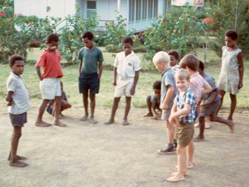 We note an American family living in Papua New Guinea during the 1970s. The Wilson family lived in Gorka. One photo shows the children opening the Christmas presents. They are having a rather American Christmas except for the way the children are dressed. The second photograoh shows the Davis boys playing marbles with local mates. I am not sure when marbes became popular in New Guinea. This snapshot interesting because of the way the family seems to have fitted in to the community. This was rare before World War II. We do not have much information anout the family, but we think they may have been missionaries. The three siblings are Brian, Randy and Cheryl Wilson. The family come from California. The lived in Gorka only a year (1972), but it is not clear the reason. The Davis, a British family, are their neighbors.
