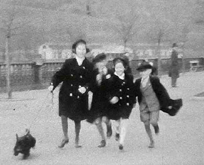 Sailor suits continued to be worn, although they gradually declined in popularity. Norfolk suits were popular in the 1920s, but by the late 20s modern looking single and double-breasted jackets were common. Boys began wearing more looking Kneepants were gnerally replaced with short pants after World War I (1914-18). Lederhosen were worn by many boys, especially in rural areas. Some boys had Alpine jackets which might be worn with lederhosen. Older boys might wear knickers, but shorts and long pants were also worn. Some boys wore smocks to school. We note very little difference between Austrian and German clothes. Germany annexed Austria to the Reich with the Anchluss (1938). Kneesocks became increasingly popular, but younger boys commonly wore long stockings in cold weather. The photograph here shows four brothers and sisters walking their Scottie in Vienna during 1936 (figure 1). The children are quite dressed up as though they had just returned from church on a Sunday although of course we don't know the actual occasion for their relative formality. The two boys, probably about 11 and 13 years old, are dressed almost identically. They wear single-breasted short