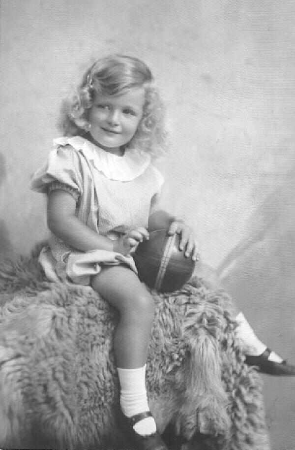 We believe that the portrait here is a an Austrian photographic portrait. We are not positive about this, but note that the photograph was offered for sale by a Vienna dealer in old photographs. If it had not been for this we would have assumed that the child was French. The photograph is undated, but we believe that it was taken in the early 1950s. We can not tell the child's gender by looking at the photograph. The long hair makes him look like a girl, but very young children like this might still have long hair. We believe that the romers suggest that the child is a boy. I'm not sure about the color of the romper suit, but believe it might be a ligt-blue outfit.