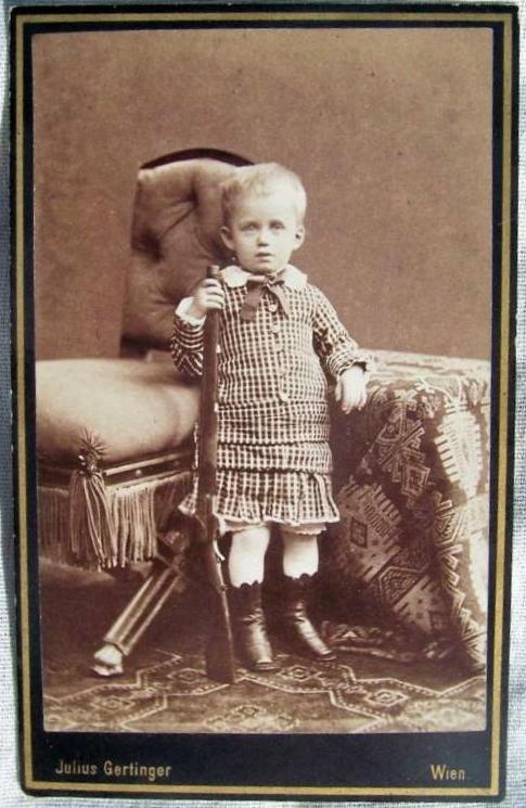We see the same photographic formats in Austria as we see in other countries. As a result of our limited Austrin archice, however, we have noy yet found examples of the various types, especially the dated examples that are useful in developing chronolohgical trends. We have found very few early Austrian photographic images like Dags and Ambros. The rarity of early photographs is similar to the pattern in Germany. This changes with the appearance of the albumen process and negative printing. We only begin to see substantial numbers of Austrian photographs with the appearance of the CDVs (1860s). From this point the photographic industry in Austria seems very similar to that of other German states. (Germany was only unified in 1871). We see similar variations in CDVs that we see in America and other European countries. Early CDVs had plain front text and pointted corners. We are not sure yet when cabinet cards appeared, probably the late-1860s. Even so the CDV continued to be popular format. By the 1870s we begin to see decorative backs. Here we see a CDV with a colored mount, looking somewhat lile a caninet card (figure 1). Notice the rounded corners. New cabinet card mounts appear in the 20th century. We also see postcard back prints along with silver nitrate printing.