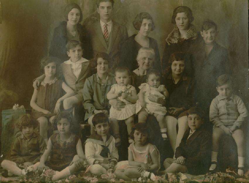 Here we see a large, unidentified Argentine family. The portrait is undated, but was taken about 1930. It could be from the late-1920s or early 30s. We are not sure, but it looks to be the grandmother with all the grandkids. They range from babies to teenagers and young adults. The age range and gender mix provides a good overbiew of popular fashions at the time. The boys wear sailor suits and regukar short onts suits. The younger children wear strap shoes. The girls wear stylish dresses. The studio with the location is not identified, but a well-to-do Buenos Aires family is likely. The portrait has been tinted to add color. The coloring suggests some of the popular colors at the time, but tining is not the same as color photography and this has to viewed with reservations as to accuracy. At least two of the children in this photo appear to wearing white long stockings. The older girl on the right and the boy in the front row in a sailor suit.