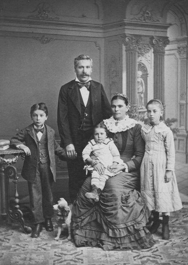 This Bulgarian cabinet card shows an unidentified Bulgarian family with three children about 3-10 years of age. They look like a prosperous middle-class family. The backdrop is rather over the top. The boy wears a single-breasted, vested, long pants suit. His older sister wears a plain dress with a ruffled trimmed collar. Notice the little grl's striped stockings. The father wears a frock coat with what looks like a wing collar. Mother wers a voluminous dress. There is a dog in the portrait, but it looks rather like a China figurine. The dealer though the portrait dated to about 1885. We would guess the 1870s, in part because of the boy's long pants and the girl's striped stockings. The ruling on the card also suggests the 1870s, but we do see ruling in early-1880s Bulgarian cabinet cards. So the early-1880s seems a reasonable guess. A factor here is the Russo-Turkish War (1878-79) was the beginning of Bulgarian independence. We are unsure if there were photographic studios in Bulgarian during the Ottoman era. If they existed, there clearly wernot very many. Note the family here has rejected all Ottoman influences. We are not sure to what extent Western clothing was worn during the Ottoman era. The family was photographed in Roustchouk which was one form form of Ruse, a town in northeastern Bulgaria near the newly established Romanian border. There were different names because of the Bulgarian, German, Romanian, Russian, and Turish influences. The studio François Bauer in Roustchouk. Interestingly the lettering is not in the Cyrillic alphabet. Bauer also has a studio in nearby Schumen. Notice that this early studio was run by a German and not a Bulgarian. Foreign photogrphers were a common pattern in the Balkans and the Ottomn Empire, primarily because the area was because of Ottoman rule so technologiclly backward.
