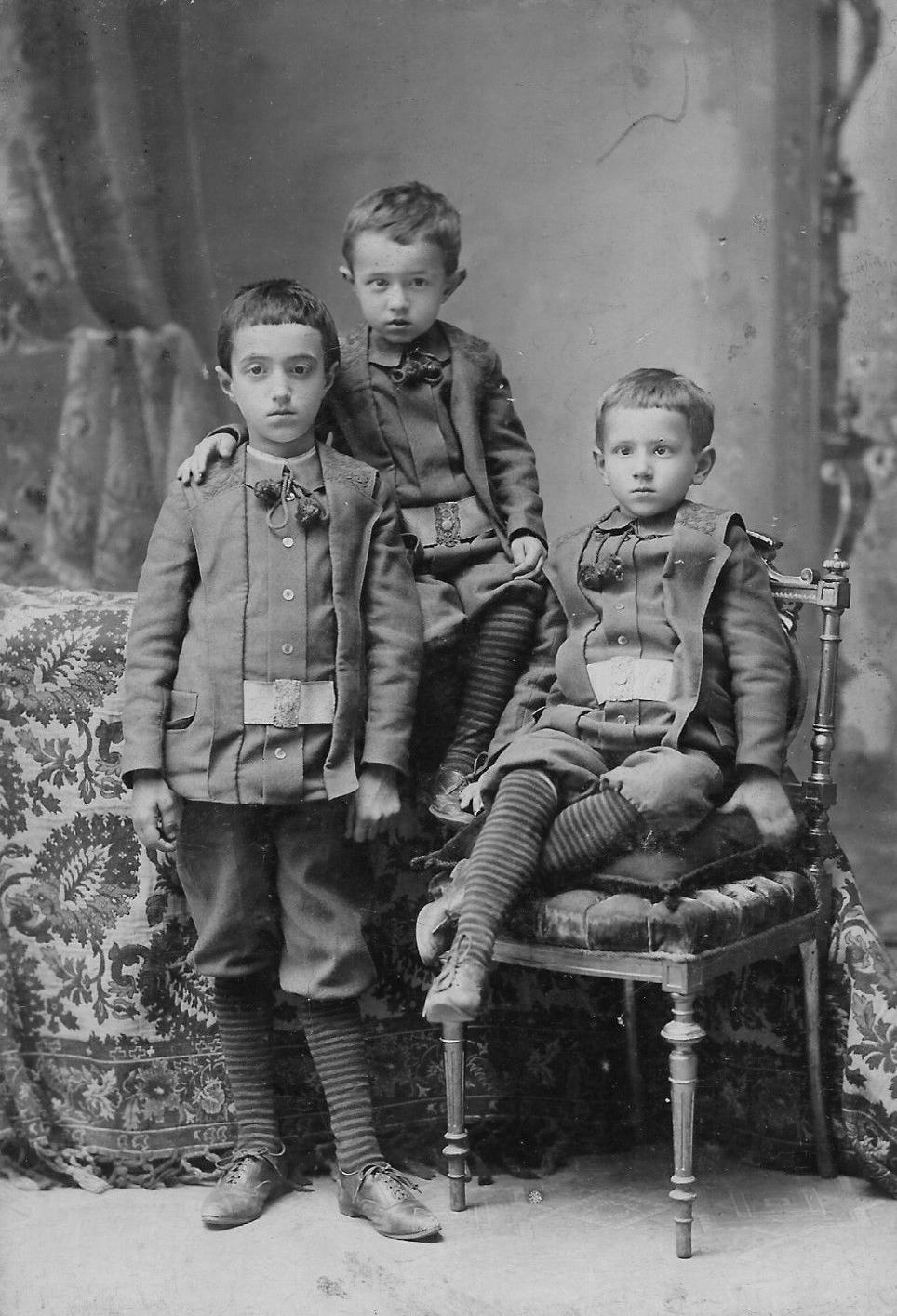 Here wse see a cabinet card portrait of three brothers from Sofia. They look to be about 3-8 years old. They are all dressed alike in matching suits. When mothers decided to do this, often little details do not match, but here everything is perfectly identical. The suits seem a largely a Norfolk styled suit. The lapels seem to ne a touch of sailor styling. It looks like the boys are wearing jackets and vests, but actually it sems on sungle garment. Rather than bows, the boys have a string tie with tassel poms. The pants are bloomer knickers worn with striped long stockings. Also notice the low-cut shoes. At the time high-top shoes were more common. The date written on the back looks to be January 27, 1898. The studio is in script, but looks to be domething like D.A. Kapacmorhob in Sofia.