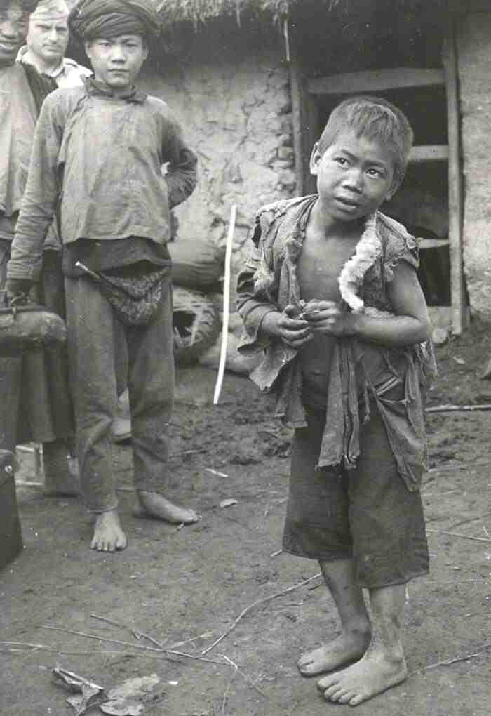 Lolo tribesmen into the early 20th century would raid the lowland Chinese to obain booty. Among the booty would be individuals brought back and set to work as slaves. The Chinese boy here ws encountered by an American journalist and Army Air Force mission looking for World War II crash sites and possible survivors was one of those slaves. The caption to this photograph was titles, "Slave of Lolo Tribesmen" and read, "This lad is held in slavery by Lolo tribesmen who acquire slaves by raids on Chinese villages. His duties include tending the flocksand he shares food and water with his captors. American Graves Registration officers met this little fellow while searching the Hulai Mountains in western China, to verify reports that missing American airmen were being held as slaves by Lolo tribesmen." The photograph was dated October 30, 1946.