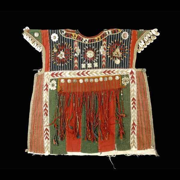 Until the Soviets incorporated the area into the Soviet Union, clothiong except for Russian officials was largely traditional. The British Museum has the yunic seen here as part of its collection. The Museum reports, "Young boys wear a tunic or overshirt (kirlik or krte) until they are four or five. It is made of seven pieces from seven tents and sewn by three or four fortunate women. They embroider it with motifs and use colours such as red that symbolize life and fertility. The borders often have hook patterns representing scorpions for protection. The women also attach a whole range of items to theshoulders and back: bells, beads, amulets, coins, feathers, cowrie shells or white buttons, tufts of hair, black-and-white cords, models of sharp tools and weapons, tubes or roundels containing texts or prayers from the Qur'an and snakes modelled in cloth. Caps and bibs use the same elements, which are intended to frighten away evil spirits and either catch the attention of the 'evil eye' or deflect it from causing harm.