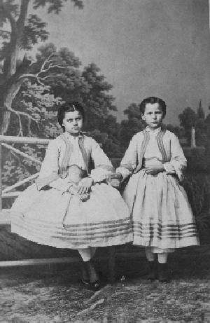 We note younger Croatian boys wearing dresses in the 19th century. This was a commonn practice in Europe. We do not know how common it was Croatia or how it may have compared to other countries. We suspect that in the major cities the fashion was similar to that in other provincial cities in the Austro-Hungarian Empire. We do not have a sufficient archive of images to make real assessment at this time. Here is a CDV from Crotaia. It is undated, but probably was taken in the eatly 1870s. (We have ot noted elaborate backgrounnds in 1860s CDVs, but our archive in mostly American. This may be different in Europe. Pictured here are a boy and girl, almost certainly siblings (figure 1). The children are not idntified, but we believe the younger child is a boy. The children are wearing cut-away jackets and dresses. The girl is seated, the boy is standing. Although not unusual for little boys to wear dresses up to the early 1900's, this is rather unusual in that the boy is a little older. One can definitely see more masculine features on the child standing and the hair style is a boyish one. The sister is quite a bit older though. The portrait was taken by C. J. Mayer, although we do not know where in Croatia.