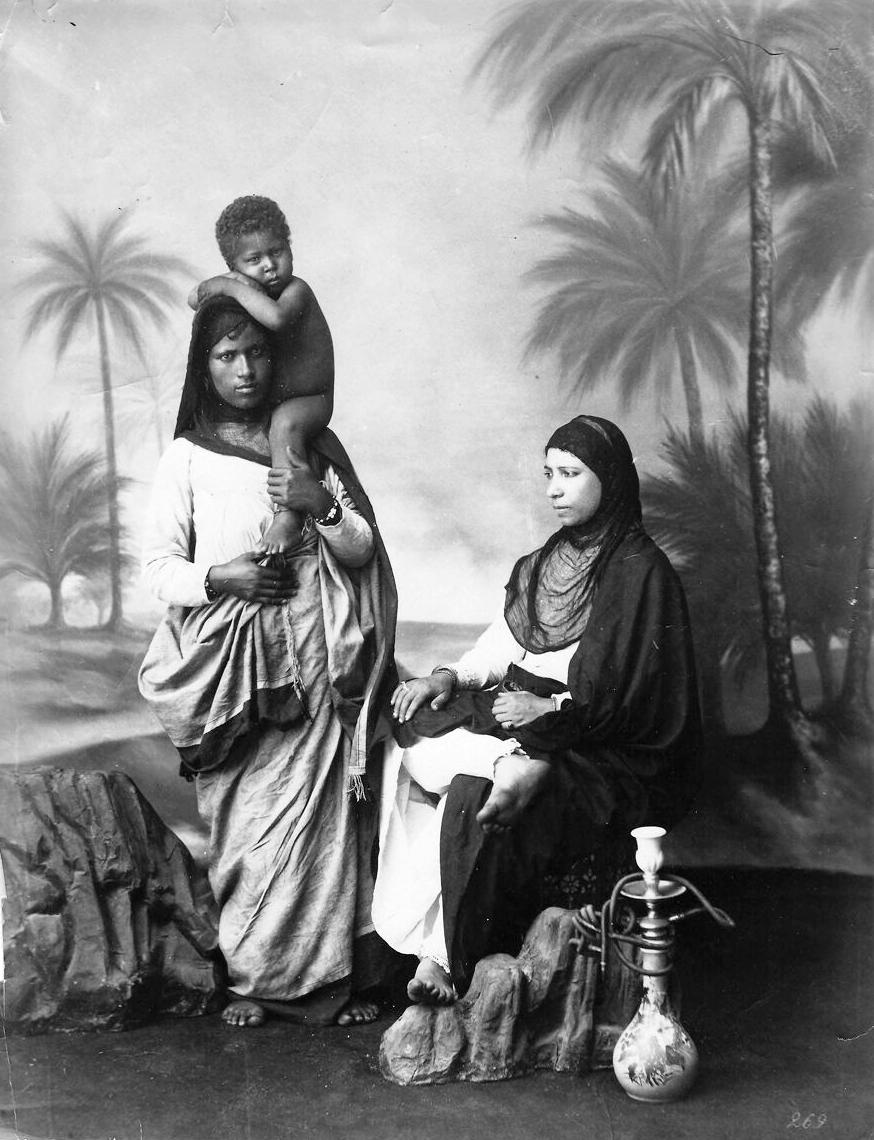 We begin to see what may be family images when European began setting up studios in Cario and other cities (1870s). As best we can tell, there was no great interest aming Egyptian men to have portraits of their family taken. The family was seen as a very private matter. At the time, few women could have had a family or individual porttait taken without the permission of their husbands. The earliest portaits we have found look more like ethnographic portaits for sale to Europeans and not portaits that Egyptian men has taken of their families. Here is one such portait (figure 1). We have no details about the family or even if it is an actual family. The dealer dates it to the 1880s, but we have found similar images taken in 1875. We at first thought it was a husband holding a child, but after thinking about it, the clothing looks more like a woman's outfit than a man's. We now think it is a houshold slave woman. The mother is probably the woman sitting down. Another possibility is that the husband had two wives. Or it may be three generatiins with the older woman may be a grandmother. We welcome readers to provide any insights that might have. Notice there are no face coverings. At the time many Egyptian women wore face coverings.