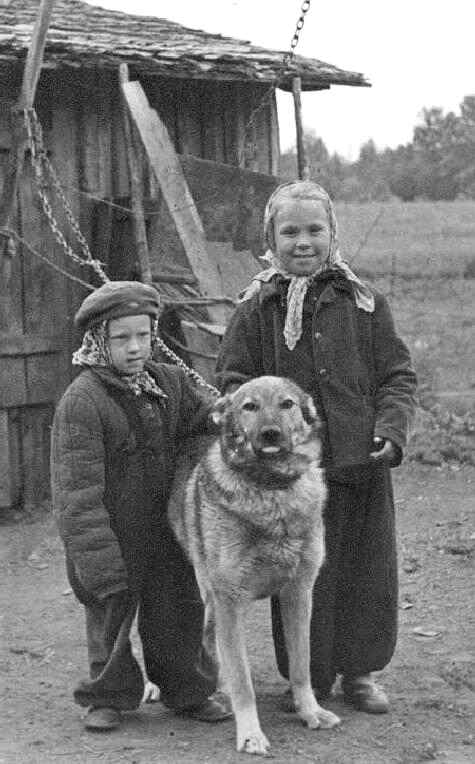 We see some children with pets, but for the most part keeping pets was difficult during the soviet era. This was somewhat easier for Esgtonians living in rural areas. Here we see some rural kids with family pooch.