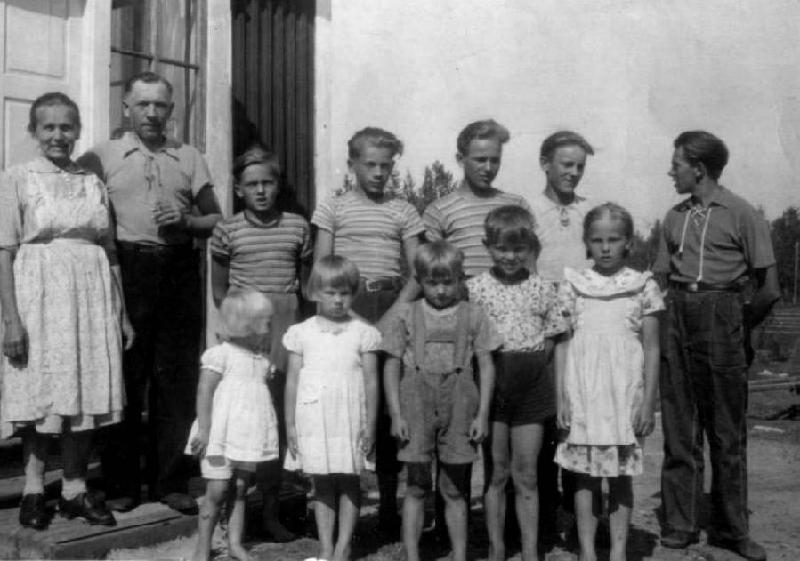 This family snapshot shows Anni and Erkki Matila with their 10 children in front of their house. The photo was taken in the village of Oijärven during 1955. There are three girls and seven boys. The boys mostly wear "T"shirts. The older boys (and the father) have these rugby-style (collar shirts that are partially open at the front) shirts. Rather than Brirish rugby shirts with stripes and buttons, thedse are solid colored shirts which have string ties. We are not sure what they were called in Finland. The boys at the front have short pants, the yougest has H-bar shorts. The boys at the back wear both short and long pants, but we can't tell which ones. All the girls wear dresses, ome with a pinafore. They look to be a farm family. Here we can begin to see the fashion difference between rural and urban families disappearing. Also notice how the clse-cropped hair cuts have disappeared and the boys all have full heads of hair.