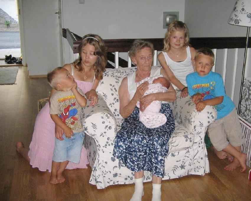 In Finland it is quite common to take off shoes entering in the house, as we can see in the photo showing a grandmother with her five grandchildren. The children are barefoot. Notice the shoes at the door. Grandmother wears socks. Notice the hard wood floors. The children all wear the same pan-European fashions now common throughout Europe.