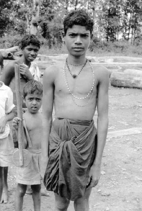 ![]() Figure 1.--This Kerala boy in 1965 wears a solid-colored "lungi" or wrapped skirt which he had folded and wraped from inexpensive "khadi" cloth. This boy was from an influential and affluent family. So it is not a question of poverty as to whether a person wears traditional or Western clothing. This boy has wraped his lungi to half length with a typical loosely wound knot. Notice the home-made toy that the younger boy has. |