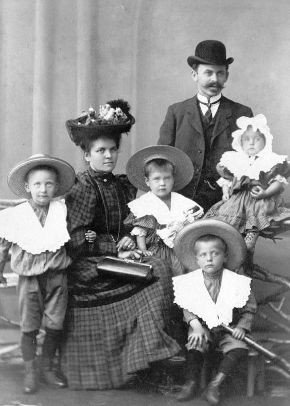 This Riga cabinet card shows a young fanily with four children about 1-7 years old, perhaps two boys and two girls. It is undated, but we would guess was taken in the 1900s while Latvia was a Tsarist province. We have no idea who the family is. They could be Latvian, German, or Russian. In Riga and other cities, the population was more mixed than he countryside which was largely Latvian. The mustschioed father wears a bowler hat with high collar. Mother has a wonderful decorated hat. Except for the baby, the children all have wide-brimmed hat. The little girl's hat is a little different than the ones the boys are wearing. We can't tell much about what they are wearing, because mother has added a huge drape over lace collar to what all four children are wearing. One boy looks to be a toy rifle. The studio was Carl Kistenmacher in Riga. Even the Schmiedestr street address is German. Many of the photographic studios in the Baltic republics were Germans.