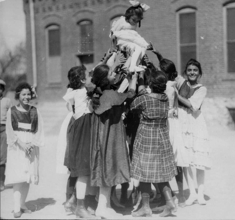 Here we see Mexican girls playing Niņa Nacio en Francia during 1921. This tramslates to Girl born in France. The name and photograph suggests it was a grl's game. We see older girls about12-13 years old forming a circle having a good time lifting a little girl in a white dress and hair bow high in the air. It lt looks like they are playing in a school yard. We do not know if the older girls get lifted as well. It would be a little difficult lifting alrger girl, but given the number of girls lying, they could probably do it. As far as we know, this is not a game that Americn girls played.