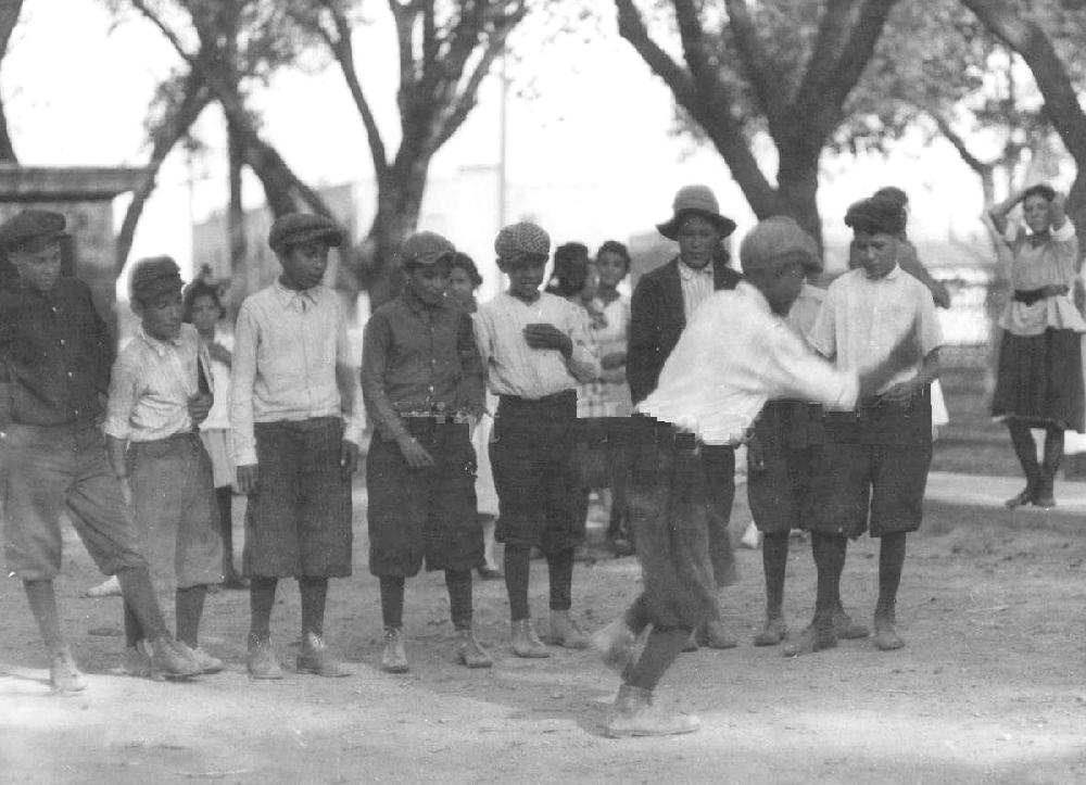 This game is calle the Nurse. We are not sure of the Spanish name, but nurse in Spanish translate as la Infermera. That seema a strange name for a came boys are paying. When I was a boy I do not think my friends and wold have been attracted to such a name. It is not clear what is involved here. All of the boys are lined up, except for one who seems to be doing a dance are kind of patomine while the other boys look on. We are guessng that he other boys take turns in front, apparently demonstaring their dance kills. We do not know just what the object was or if any kind of winner emerges. Another photograph shows the by still dancing (figure 1). It suggests that the boy in front was pimarily doing a dance routine. The other boys seem impressed with his skill.