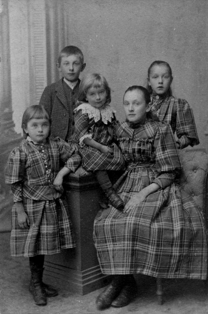 Here we have a CDV portrait of an unidentified Norwegian family. CDVs continued popular in Europe after they were non longr common in America. The portrait is undated. We would guess it was taken in the 1890s. At this time, Norway was still part of Sweden. Here the dress styles are a useful indicator. There are five children, four girls and a boy about 3-15 years of age. The girls all wear dresses mother must have made from the same plaid fabric, but in different styles. We are not sure about the color of the dresses, but one might guess that red was the dominant color. The boy wears a patterned vested suit with a short that does not seem to have a collar. Rather it sems to be a kind if shirt waist that just buttined at the collar. All the children seem to be wearing long stockings. They seem to be different colors, both medium and dark shades. Perhaps some were chosen to go with the dresses. Notice the different hair styles. The youngher girls have bangs. The older girls have their hair drawn back in arather severe style.