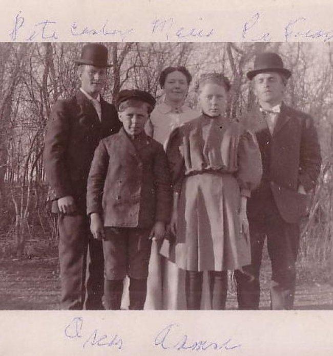 wearing a flat cap with a very short bill. This is clearly a family photo, taken in winter (note the bare trees in the background). The names are written on the potograph. The writing is hard to make out, but there are apparently three children, whose names are written above ans below the figures, perhaps some time after the photograph was taken. To me they look like "Pete", "Casberg" (maybe the Norwegian for Casper?), "Maiis" (pronounced Mai-is?), and "Pa Forcz" (the father, apparently). It looks like they didn't know the name of the mother. Below I thinl"Oscar" is written and another name we can't make out. This is just wild guesswork on our part.