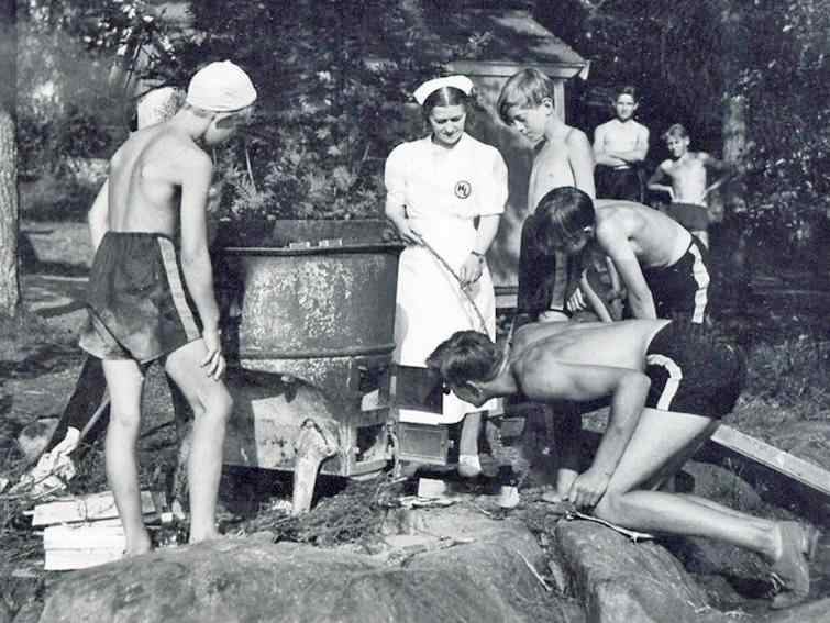 We note some boys wearing uniforms like American children wore at summer camp. We are not sure, however, just how common this was at Swedish camps. In America, this was most common at the camps for well-to-do children. I'm not sure if this was the same in Sweden. Here we see boys with a camp uniform of striped shorts (figure 1).