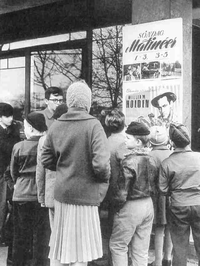 American children did not as commonly go to the movies on Sunday as so many attend Church and are egaged in Church activities. Mny American parents did not think it quite appropriate to go to the movies on Sunday. Here the children are going to see an Americam film, but Sweden has an important film industry of its own.