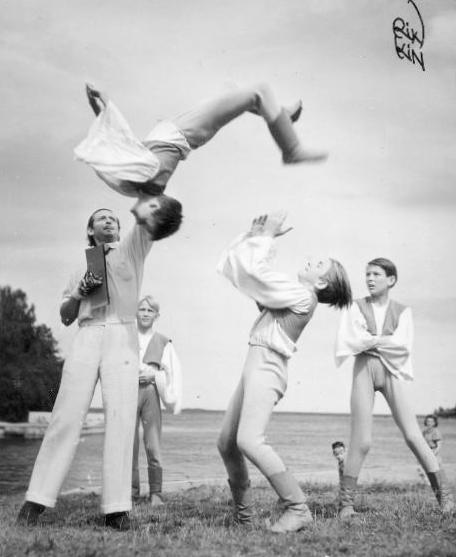 We do not yet know much about the different areas in which Swedish children worked. We do note boys training as acrobats in the 1950s. We assume they performed in circuses. We do mot know the name of the group, but there is some writing on the mount in Swedish that we can not read. Cicuses were still very popular in Europe among children as television was just beginning to catch on, especially in early 50s. The boys appear to be wearing their performance costumes that thave a Russian cossack look. They also wear baggy tights. There are four boys. They look a little to close in age to be a family group.