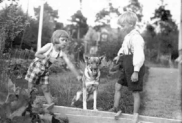 Here we see a Swedish boy and girl in what looks like a rural village during 1945 (figure 1). They are playing with their dog during the Summer. The boy wears long short pants with supenders. We suspect the children in the cities would have dressed more fashionably. A reader suggests, "I suspect that those *are* city children. The outfit worn by the girl was certainly not traditional rural clothing. I think that these were children of a prosperous family that stayed at their country home in the summer or visting grandparents.