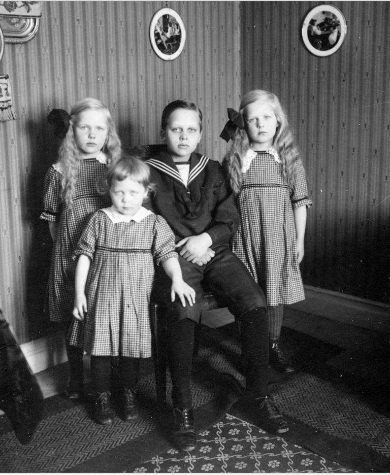 These Swedish siblings look to have been photographed during the 1910s, probably the late 10s. We would be tempted to say 1920 except that the boy's knee trousers are a bit longish for the 1920s. Notice that the girls are all dressed alike. The fact that the same checked material has been used suggests that the dresses were home made by their mother. The two older girls have dark hair bows. We are not sure about the color. The boy's sailor suit is a traditionally styled sailor suit with knee pants and black long stockings. The boy looks to me about 10-11 years old. Notice the oval family photos on the wall behind the children. A reader writes, "Notice the boys long knee trousers. I wonder if it was either bought or