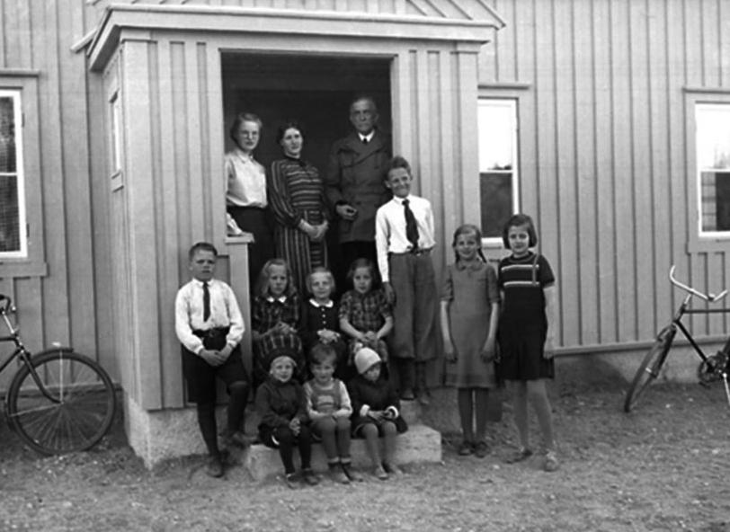 This is a middle class Swedish family photographed in 1940 on the doorstep of their house. We are not sure if it is a country or small town home, but it does not appear to be in a city. We don't know the exact location. There are so many children at about the same age that we think a few must be neighbors or else close relatives. All the children seem to be wearing long stockings, although we are not sure about the oldest boy (about 13 years old or so) who is wearing rather long knickers. We do not know if he is wearng long stockings or knee socks. Hard to think of this photo as a wartime scene even though 1940 is the date and the Germans had already launched the war by invading Poland and nearby Denmark and Poland. Sweden managed to remain neutral during the War. This family looks reasonably prosperous, but although not invaded, Sweden sufered economically during the War as they could only trade with Germany. Notice that at least two of the boys are wearing white shirts and ties. The two youngest boys wear short pants. One of the boys wears H-bar shorts.