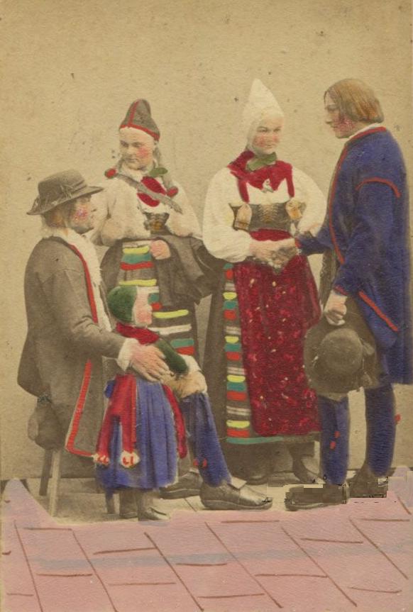 Especially elaborate outfits were brought out for special festivities. One auhor suggest that folk costumes became 'uniforms of equality'. The upper-classes (aristocracy and rich bourgeoisie) in contrast dressed alike, commonly in styles developed in Paris and London. By the mid-19th century, major changes were under way in Sweden. The Industrial Revolution was bringing about huge changes in the lives of ordinary individuals. The most obvious changes were in the cities, but gradually reached the countryside as well. One of the changes is that the standard European styles that were once primarily worn in the cities began to be worn in the countryside as well, gradually replacing folk styles. As this ocuured a reaction gradually developed, a kind of ronantic nostalgia for the simpler earlier days. Part of that romanticism was an interest in the disappearing folk costumes. We do not have lot of information on this, but we see CDVs confirming this developing interest as early as the 1860s (figure 1). This of course means that the actual interest began even ealier.