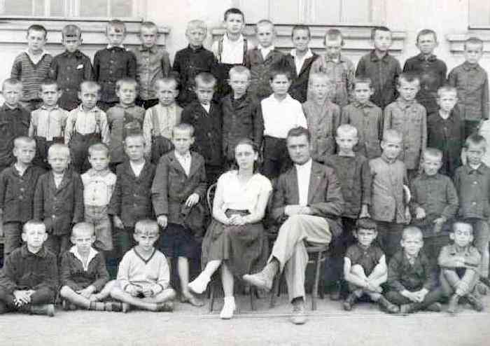 Many Polish boys in the 1930s seem to be wearing clothes that look more like the 1920s. This may not have been the case of boys from fashionable families in Warsaw and other important cities. It does seem to have been the case in smaller towns and villages. The school portrait here is a good example. We are not sure if this reflects income levels or a more conservative fashion outlook. Perhaps some other factor is involved. Suits becme somewhat less common in the 1930s. Notice that many boys here are still wearing the earlier fashion of jackets buttoning at the collar. These jackets were no longe worn in America and Western Europe and were no longe very common in Germany. Many boys went to school in just shorts or shirts and sweaters. Sport collars were worn, but not very common. We notice sailor suits passing out of style. We notice boys in the 1930s beginning to wear short cut short pants. Long stockings were still common, but not as common as in the 1920s. Boys were increasingly wearing ankle and kneesocks. A HBC reader wrote, "The Polish reader wrote, I find it interesting that the hosiery seems to be so varied. Long stockings, ankle socks, knee socks--and, if I'm right, one boy barefoot. This seems to be similar to the 1951 Austrian photograph of a school class where the same variety is observable. Am I right to assume that the long stockings have nothing to do with chilly climate and are just a bow to old-fashioned formality? Or is there another explanation? Is class distinction relevant?" HBC has no additional information on this photograph. Given the range in attire, not only the hosiery, but also some boys in shirt sleeves and others in jackets the season is a bit difficult to assess. We would say, however, that long stockings look to us to be becoming associated primarily with seasonality. One notable observation is that almost all of the boys have close-cropped hair.