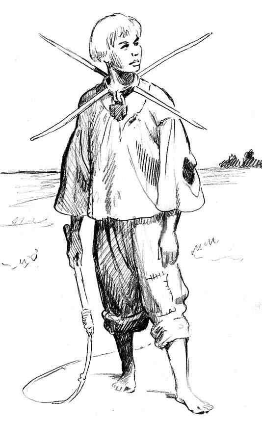 because they lived with their parents, was a much more humane condition than that of the yard boys. In the summer serf boys were clothed usually only in canvas shirts and pants. Boys also commonly wore a canvas shirt and a long linen jacket (kaftan). Such clothes might be worn in spring or autumn. Boys during the winter and other cold days might wear bast shoes (lapti). In the summer serf boys would go barefoot.