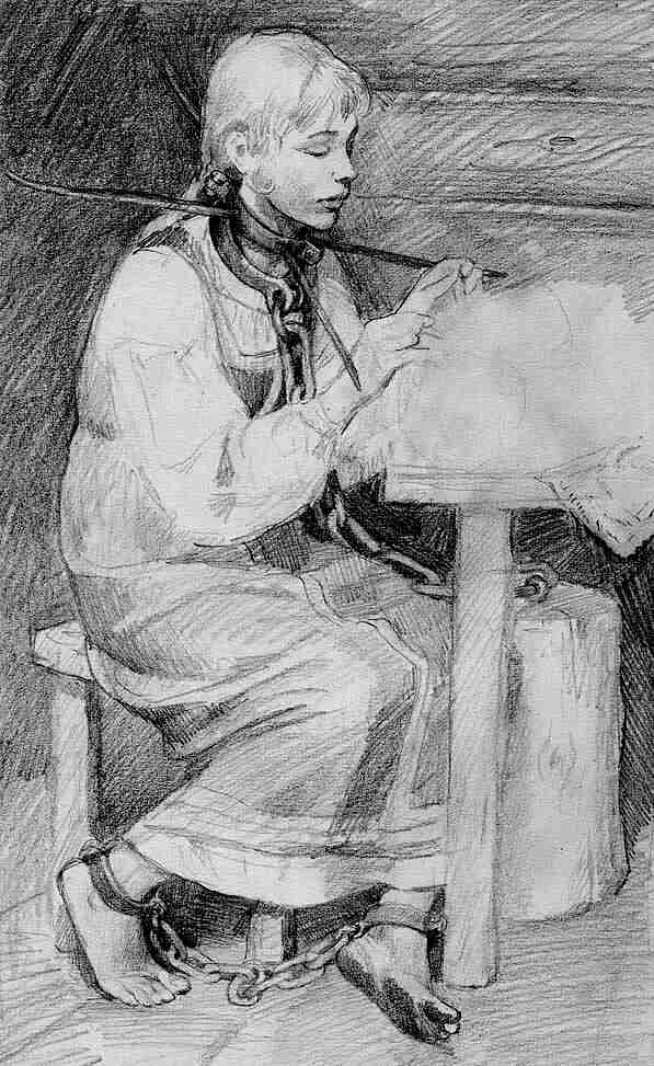 We know less about serf girls. They presumably were assigned a variety of domestic chores. There was also agricultural jobs assigned them. Here we suspect that the type of jobs were quite simlar to those assigned slve women in America. Differences probably reflected the crops grown more than any basis difference in appeoach or status. Russian landowners often focused on grains while American plantations focused on cotton. We do know that girls were usually not shepherds. This was probably because boy shepherds were out in areas where seep or cattle were grazing by themselves which was probably seen as unsafe for girls. Attractive serf girls were commonly chose as house servants. The same occured in America, although here light skin was a factor. A problem that serf girls faced was the ability of male landowners to abuse them. The illustrator here shows a serf girl wearing an iron collar (rogatka). We suspect this was more common for boys because girls tend to be less rebelious and more obident, but we have no actual sources indicating how common this was.