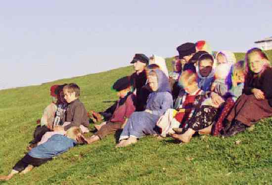 As Russian began to indutrialize, an urban wirking-class developed in the cities. The great bulk of the population was, however, the rural, largely peasant population. A substantial part of the rural population was barely part of the moneyed economy. They dressed very differently than the prospeous urban population. Many rural boys still wore the peasant tunics that were still standard in the 19th century. Rural girlswore plainpeaant dresses, often with head scarves. The noted Russian photographer, Prokudin-Gorskii has left a wonderful color record of the Russian Empire in the early-20th century. Unlike the studio photography, he did not focus on the upper-class and prosperous urban middle-class. Here we see a fascinating image of a group of rural peasant children in 1909 (figure 1). Many rural children ccommonly went barefoot in the summer. The prosperous middle-class was growing, so the photographic record forthe early-20th century is substantial, at least until the tragic outbreak of World War I (1914).