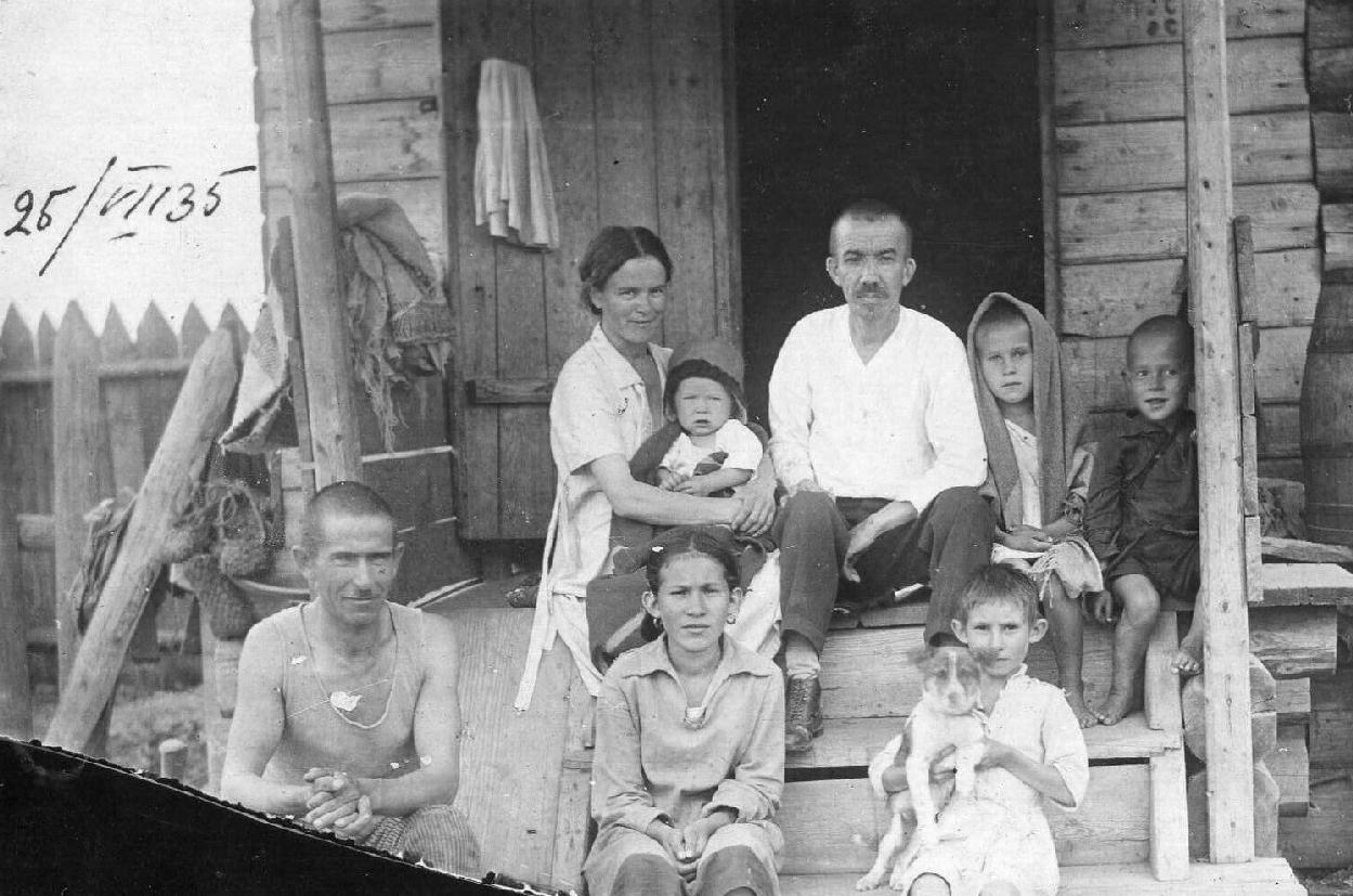 This snapshot is dated, we know it was taken in 1935 which proably merans that it was a family on a collective farm. All we know for sure is the date. There are interesting aspects to this photograph. The family does not look very prosperous, but they do have a dog--which is a positive sign. And you have to consider it was probably a warm summer day because the photograph was taken in July. It is also important to note that bcause if the Soviet internal passport system, the family was not free to leave the farm--essentially becoming news serfs. This is the most extreme exampole of what an important economist was talking about in his writings. [Hayek] Because conditiions on collective farms were rather poor, the Soviet Government used the passport system to precent farm worketrs from leaving the farms. In most countries, people on farms usually fared better in terms of food. This was not the case in the Soviet Union. The NKVD was so efficent in controlling the food that even in terms of food the collective farm workers fared poorly. Parents would send the children out into the fielkds at night which became a serious crime in the Soviet Union leading to sentencess in the Gulag. [Solzhenitsyn, pp. 57-58.] This dangerous theft of socialist property led to 10-year sentences. Farm workers were more sucessful in hiding food from the NAZis than the NKVD.