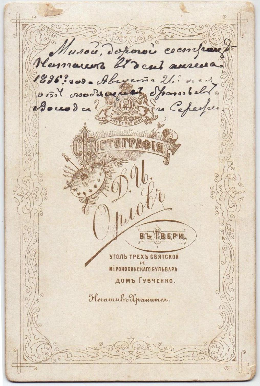 We note the children of Tsar Alexander III wearing sailor suits into their teens (1890s). Here we see two Russian brothers wearing identical sailor suits (figure 1). The portraitb is dated 1896. There is a very Russian back drop with virch trres. Notice the distinctive large ancors on the dicky. The writing on the back reads, "Photographer Dmitry Ivanovich Orlov. City of Tver, Russia. Peasant of the village of Negulino, Slavinsky volost, Makaryevsky district, Kostroma province. In the photo are the brothers Volodya and Serezha. August 26, 1896." Tver is a town west of Moscow. It would have a tumutuous 20th century history. As part of the Soviet atheist campaign, the NKVD blew up the Saviour Cathedral (1936). The NKVD murdered more than 6,200 Polish policemen and POWs from the Ostashkov camp (1940). A similar action to the Katyn massacres. The Germanas as part of the Barbarossa campsign entered Tver (renamed Kalinin bu yhe Soviets) (October 1941). They burned diwn the city. Kalinin was the first major city in Europe to be retaken from the Germans. We do not understand why the ophotographer would be identified as a peasnt. It could be a translation issue or something related to the Tsarist social structure.