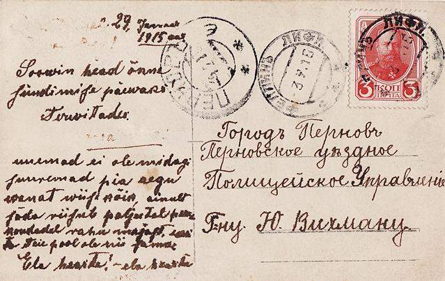 The postcard is fates January 15, 1915. At this time Estoniaas still securely in Russian hands. The Russian and German armies ar this time werestruggling for control of Poland.