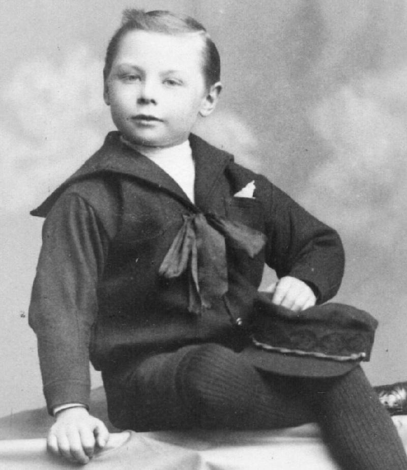 Scottish and other boys did not always wear sailoir headwear with sailor suits. We notice a Scottish boy wearing what looks like a late-19th century peaked British military cap (figure 1). This would have been an officer's cap. Note the enbroidered designs. We are not sure what the proper name is for these caps. He wears it with his sailor suit, probanbly about 1890. We do not think these caps were very common for boys, but our archive of 19th century Scottish images is limited. Nor do we know if these caps were worn with other outfits. As far as we know, these caps were a 19th century style.