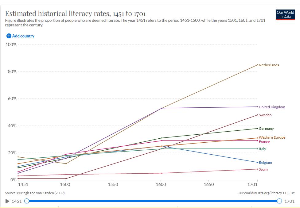 Of all the factors that undermined the Spanish Empire and the Latin American republics that grew out of it was the concept of wealth. In the Spanish mind wealth was a finite substance to be dug out of the earth like gold and silver. In Mexico and Peru the gold and silver was produced by Amer-Indian campesinos under horrific conditions as virtual slaves. An even greater source of wealth was agriculture which produced crops. In both Spain and the Spanish colonies a small group of landed families who owned almost all of the land. The land was worked by land-less peasantry who eked out a basically subsistence existence. In Spain it was the basically feudal peasantry. In the Empire it was the landless Amer-Indian peasantry. The merchant class was much less important than in England. And there was no real concept that the population was Spain;s greatest resource and to develop and nurture that population was the real way of generating wealth. This would be a concept that began to develop in Protestant society, basically because one of the basic tenants of Protestantism was to study the Bible which of course required the ability to read. This set the Protestant countries of Northern Europe as well as the English colonies in North America on the path to educating the population, creating societies that could generate wealth as never before. Spanish sources wax eloquently about the glories of Spanish Spanish authors, artists, scientists, and architects. And there were real achievements. Only there were so few literate people in Spain and Spanish colonies that only a very narrow segment of the population was exposed to those achievements--about 5 percent, less in the colonies. [Buringh Van Zanden] Literacy was low in Europe, but especially low in Spain. It is difficult not to see this as a factor in the decline of Spain and its empire with literacy rising in the countries that Spain was competing against. A variety of factors can affect literacy, but clearly a major factor was the Protestant Reformation that Luther launched (1519). Beginning with the Protestant Reformation, literacy began to increasing in Norther Europe and did so exponentially. And literacy did not increase in Catholic southern Europe. This relates to the fact that a major tenant of all the different Protestant reformers was the need to read the Bible, and this inckuded women. Of course to do that you had to be able to read. This meant that not only were more and more of the European population was able to appreciate a country's cultural achievements, but more and more of the population could help create such cultural accomplishments as well as to generate technological and economic advances. A country with a literate population were much more capable developing both culture and wealth--the two are highly correlated. Note the high ranking of the Netherlands and the United Kingdom, surely a factor in the economic rise of both countries. And the decline in Belgian literacy occurred after the Spanish reconquest re imposition of Catholicism in the southern Netherlands. Also important to note is how Spanish literacy rates did not increase significantly despite the huge influx of wealth from the American colonies--especially gold and silver. France is also interesting. Literacy was below the Western European average and not increasing, even though thanks to its productive agriculture, France was the richest country in Europe. After the Netherlands, Sweden reported the most impressive increase which correlated with the rise of Protestantism here. Germany is an interesting case. Literacy rose, but not spectacularly. It is important to note, however, that half of Germany remained Catholic during the Reformation and the German states were devastated by the Thirty Years War (1618-48). Although the future United States is not included here, academic studies shoe that literacy rates were much higher in the Thirteen Colonies than in England, ranging from 60-80 percent depending on the colony and chronological era {Grubb]. Some of the English colonies even exceeded 90 percent.