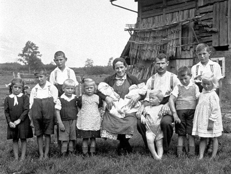 This photograph shows the Stadler family, a farm family near Attinghausen (Uri canton), They were photographed during World War II on June 27,1942. They alredy had 11 children. The elder son looks to be 12 or 13 years old, and the younger ones are two twin babies. We can assume that later the family had other children. They were presumably a Catholic family. The boys wear long short pants held up with suspenders. The younger girl wears a pinafore. Some of the children are barefoot and others wear shoes.