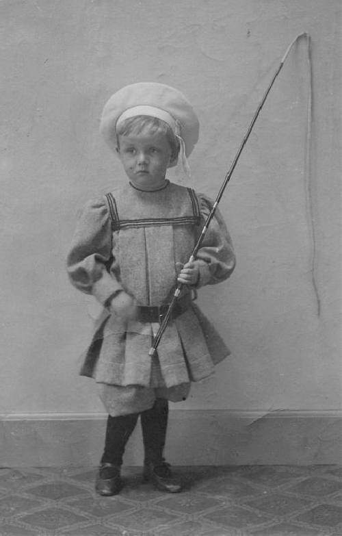A little older father wore a sailor-styled tunic with a saucer sailor cap. Notice the white side streamers on the cap. Father was photographed here in 1899. He looks to be about 3 years old. These tunics suits were a very popular outfit for younger boys. They were commonly used as kind of a transition from dresses to pants. Nore that they are a skirted garment, yet worn with bloomer knickers. They were done in diffrent styles. The tunic suit father wears is a sailor tunic. He weasks black long stockings and strap shoes with the outfit. He is pictured holding a horse whip. I am not sure just why, but we note that boyss wearing dresses at the time were often posed with props to emphasize that they were boys. Perhaps that is why he was posed with a whip here.
