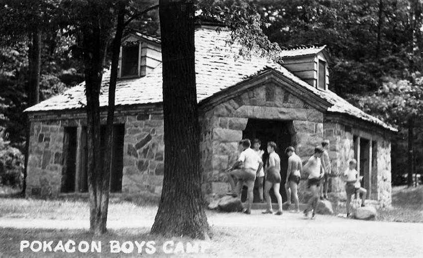 Camp Pokagon for boys was located on James Lake near Angola, Indiana. It appears to have been a Civilian Construction Corps (CCC) camp during the Depression. The camp building in the photograph we have looks like a CCC-built building. You see similar buildings with this stone constructions in state and national parks all over America. The CCC also built a tobogan run. There was a related Pokagon Girls' Camp on Lake James (1945-78). There is also a Pokagon State Park on the the James and Snow Lakes and the camp which is also attached to Little Otter, Big Otter, and Jimmerson Lake. These camps are name after thev Pokagon Band of Potawatomi tribe which inhabited the area. Indiana in the early 19th century was territory reserved for Native Americans when Ohio was being settled. We are not sure when the boy's cam was founded. We know it was operating in the 1950s and 60s. We note a single internet posting, "I worked as a counselor at the boys camp in 1961.Several of us borrowed some bikes from campers etc. And used them to ride down the tabogon run. Wheeeeeee! This was the greatest times of my life. Have been back from time to time and always go home sad !" Other wise we have been unable to find information about the camp.
